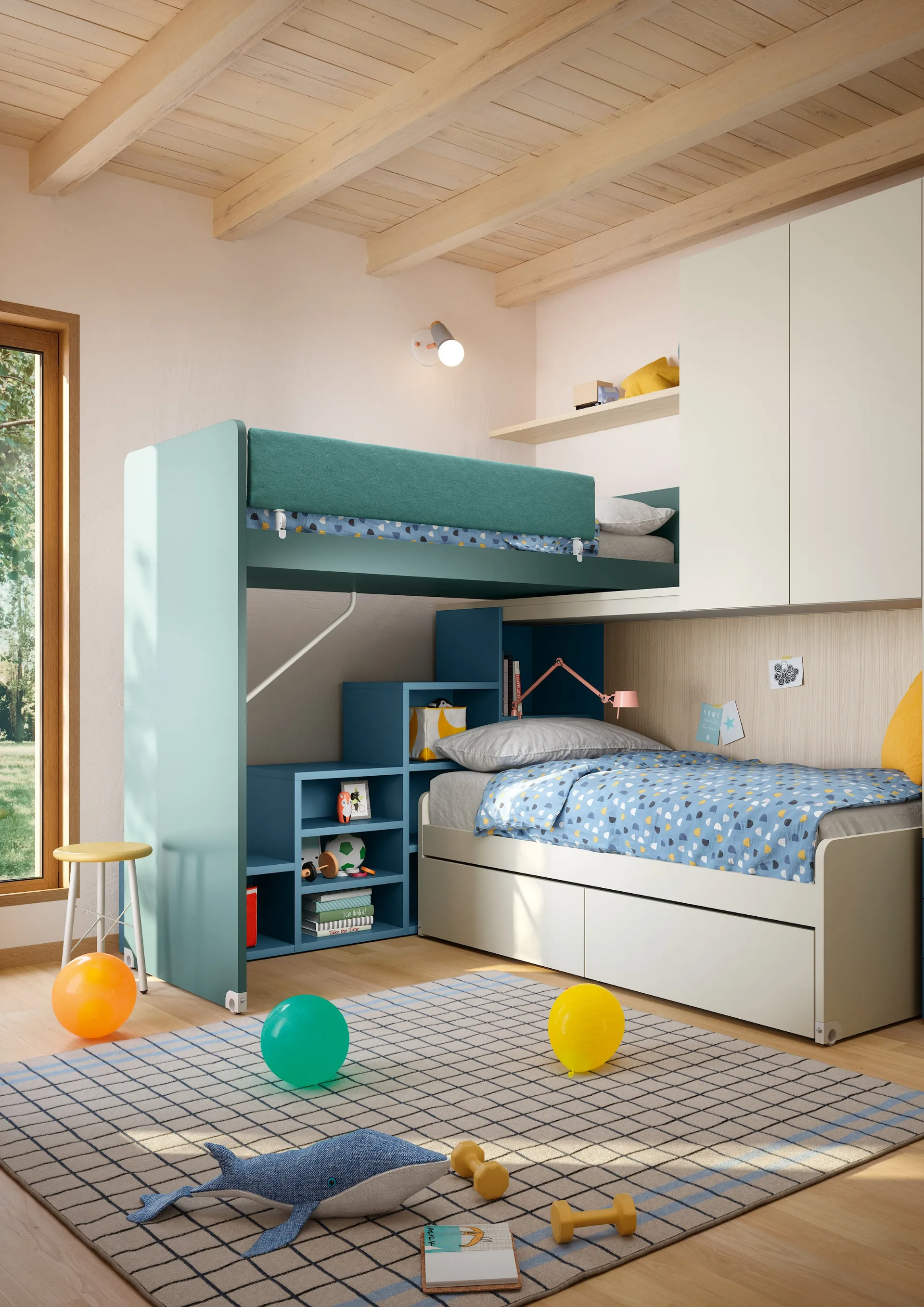 Arreda stanzette moderne con le Camerette a soppalco Nidi! Il modello Soppalco Scorrevole Slide in melaminico è per bambini.